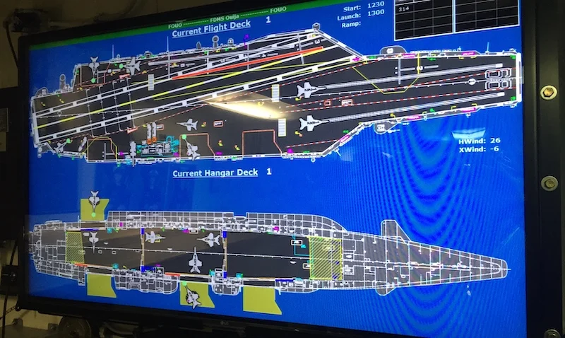 The hangar area of the Nimitz is about 900 ft long and 250 ft wide. That’s a very large space when empty, but a very complicated “parking” area for 30+ jets, a dozen helicopter, crates and boxes and small vehicles. The technology –as well as the price tag--on the jets is staggering. So, as we entered the room where the parking logistics are worked out, I envisioned sophisticated computers, monitors and cameras.
