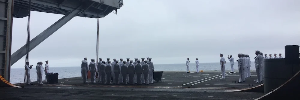 Shortly after landing on the carrier, our group was informed that during our stay we were going to see something that few visitors ever witness, burials at sea. The ashes of 32 sailors were being honored in a time-honored ceremony. As we gathered on the hanger deck, 32 sailors, chosen at random, in dress-white uniforms, one by one heard the name of a deceased sailor and carried that sailors’ ashes to an aluminum plank overhanging the ship’s side. Following a crisp salute, the plank was tipped, and the ashes slid into the sea. Several hundred sailors stood near us and had voluntarily come to watch. These sailors did not know any of the 32, but they stood for the full 45 minutes until the final tones of “Taps” left the hangar deck. From time to time I glanced over at them, and I was touched to see tears on some of their faces, tears for 32 men and women who they did not know.