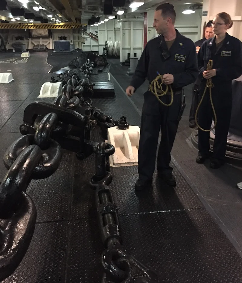 We were not allowed into the area of the ship’s nuclear engine, but we were briefed on the speed and dexterity of this huge vessel. An hour or so after the briefing, we were taken to the forward-most part of the ship and shown the anchor cables. Hundreds of feet of cast-iron anchor chains, each link 2x4 feet and weighing in at 350 lbs., were held in place by powerful hydraulics.